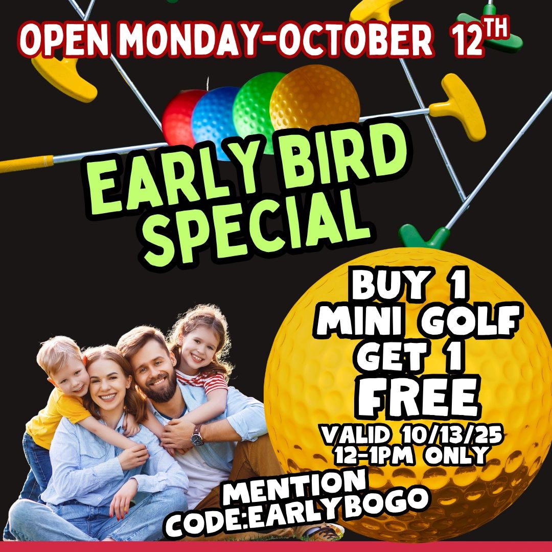 THIS MONDAY-COLUMBUS DAY SAVE ON MINI-GOLF FROM 12 - 1PM with CODE:EARLYBOGO